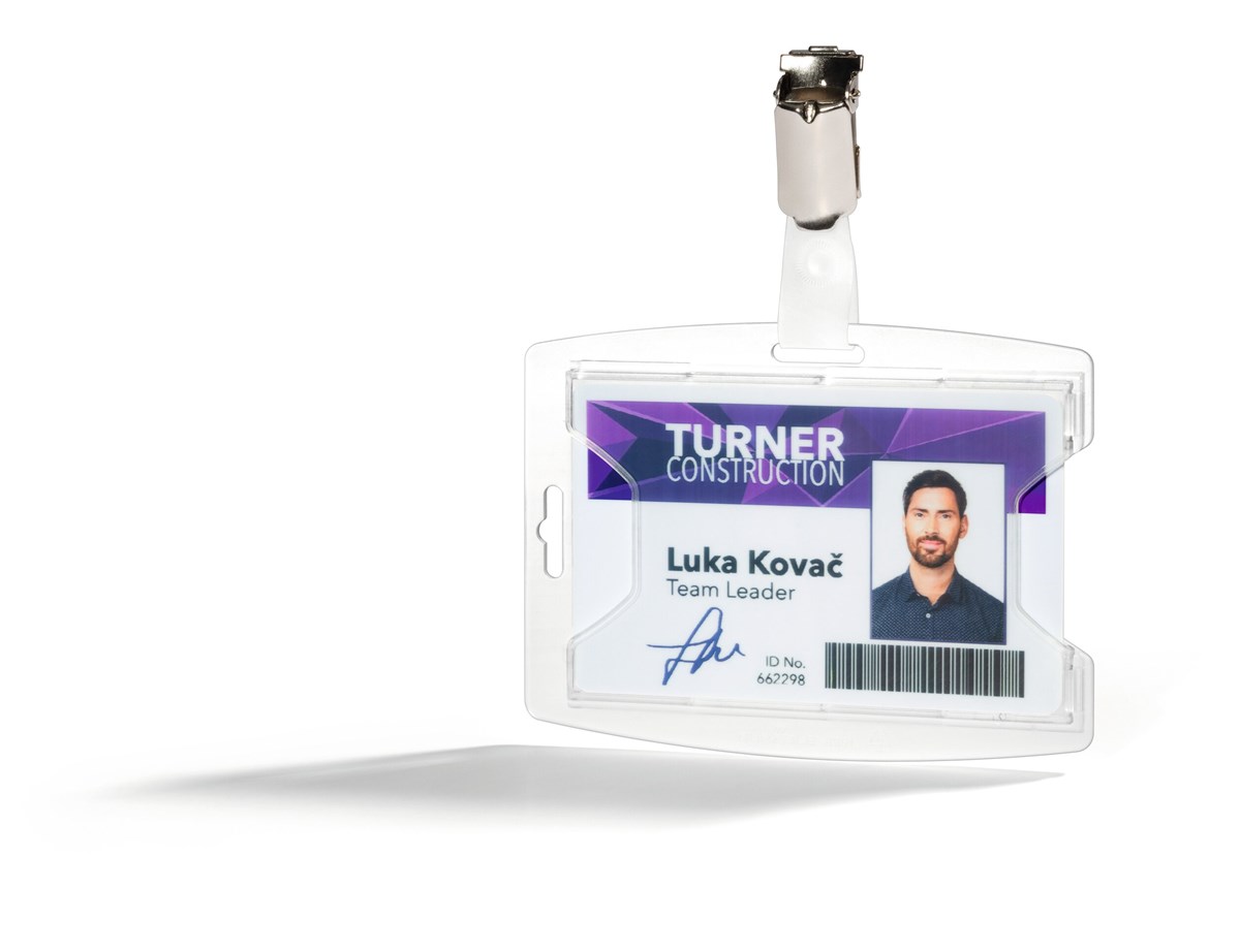 Ett bra val för en organisation som vill minska sin miljöpåverkan! Denna korthållare av 70% återvunnen polypropylen har en täckt framsida som skyddar kortet och en materialbesparande baksida. Tumgrepp gör det lätt att ta ut kortet. Tåligt material som som klarar daglig användning utan att hållaren spricker. Levereras med ett vridbart hängselclips, som gör att kortet alltid hänger rakt. Kan användas i liggande eller stående format. För standardkort ca 54x85 mm.