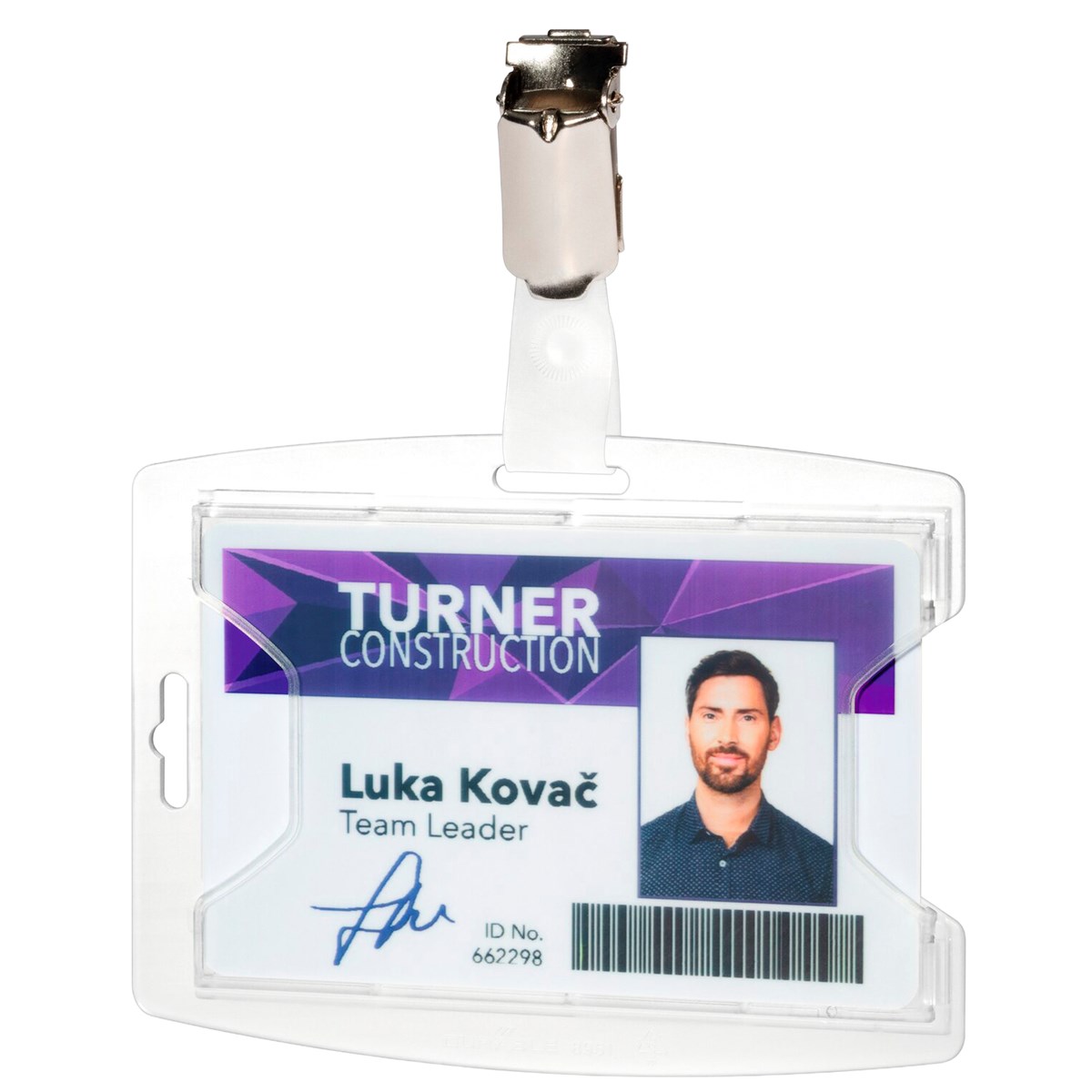 Levereras med ett vridbart hängselclips, som gör att kortet alltid hänger rakt. Kan användas i liggande eller stående format. För standardkort ca 54x85 mm.