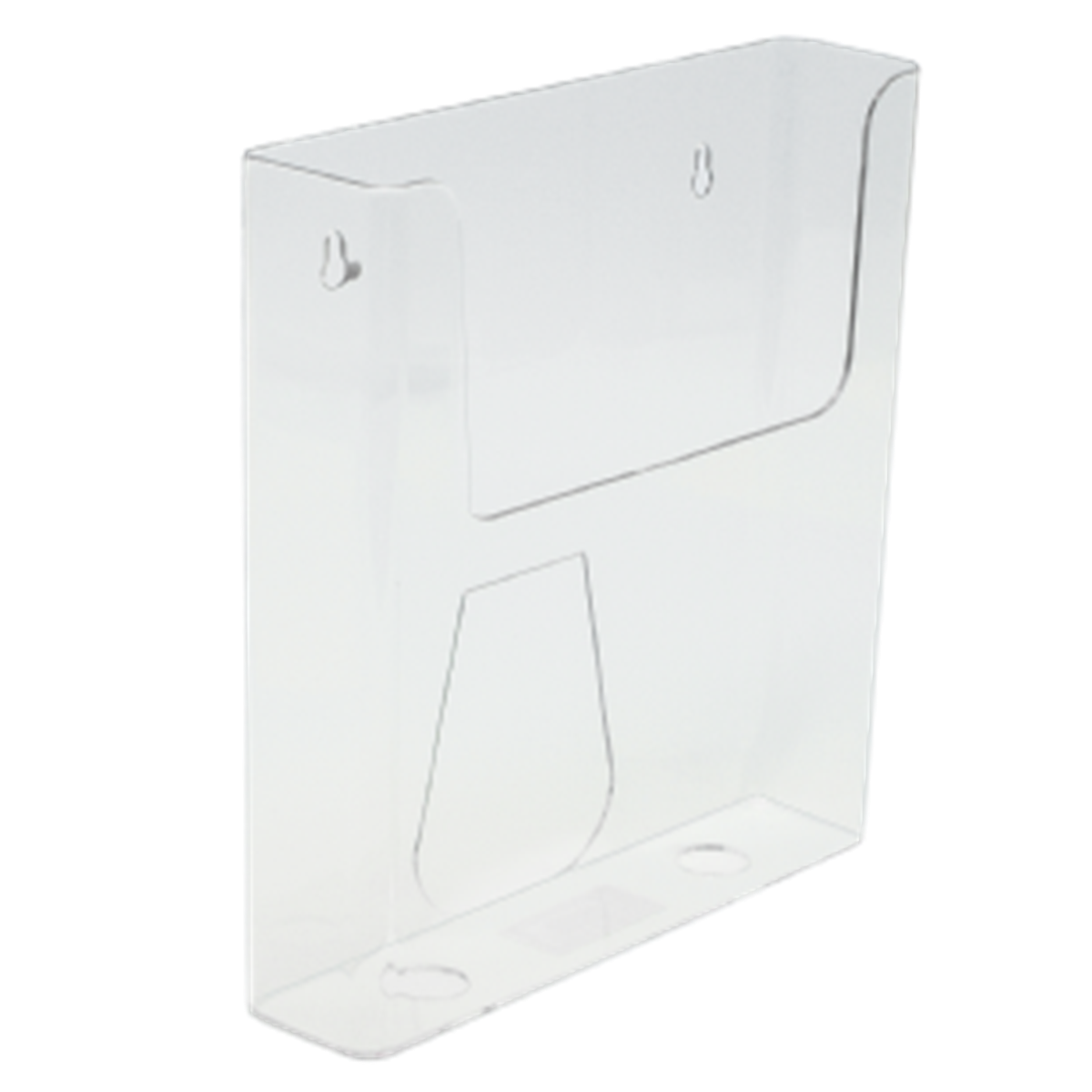 Broschyrbox som enkelt monteras på vägg. Stället är tillverkad i glasklar akryl och har ett fack.