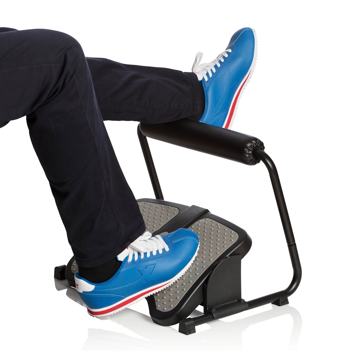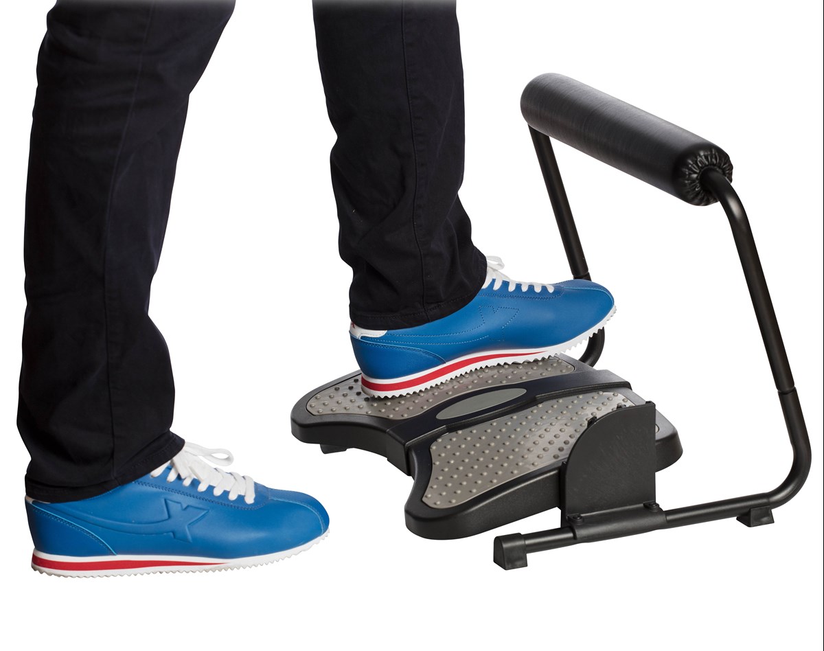 Justerbar höjd och vinkel Intuitiv lutning av fotplattan för att aktivera de nedre benmusklerna Avfasad för att passa skrivbordsstolen och bibehålla närheten till skrivbordet Mjukt vadderad supportkudde Förebygger trombos och så kallade ”kontorsfötter”