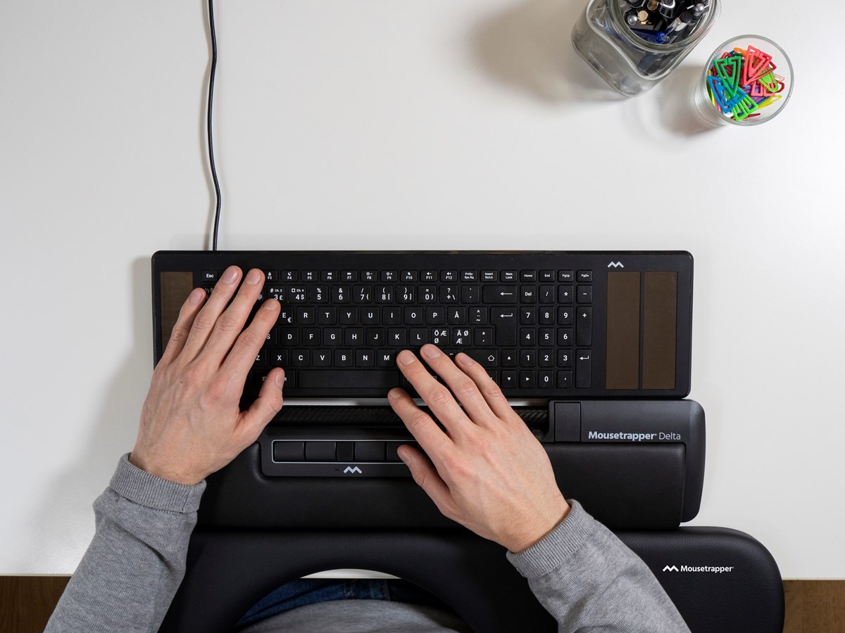 Den centrerade placeringen av Mousetrapper framför tangentbordet ger en god ergonomisk arbetsställning med armarna nära kroppen och händerna nära tangentbordet. Det innebär att du både förebygger och många gånger kan lindra de belastningsskador som kan uppkomma i samband med att du jobbar utanför din egen axel – som du gör med en vanlig datormus. Du behöver alltså inte sträcka dig efter musen på skrivbordet längre. De breda och mjuka handlovstöden ger samtidigt stöd och avlastning för nacke, axlar, arm och handled.