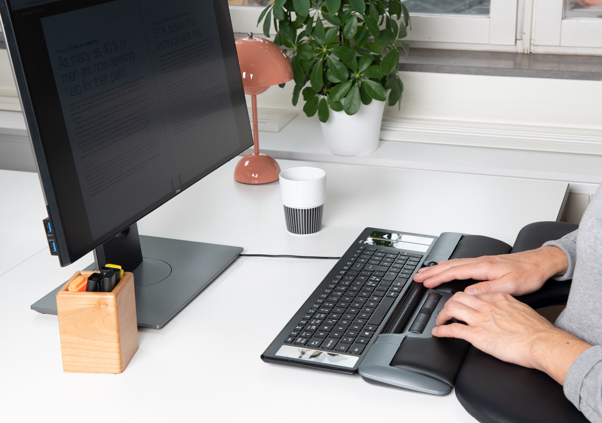 Den centrerade placeringen av Mousetrapper framför tangentbordet ger en god ergonomisk arbetsställning med armarna nära kroppen och händerna nära tangentbordet. Det innebär att du både förebygger och många gånger kan lindra de belastningsskador som kan uppkomma i samband med att du jobbar utanför din egen axel – som du gör med en vanlig datormus. Du behöver alltså inte sträcka dig efter musen på skrivbordet längre. De breda och mjuka handlovstöden ger samtidigt stöd och avlastning för nacke, axlar, arm och handled.