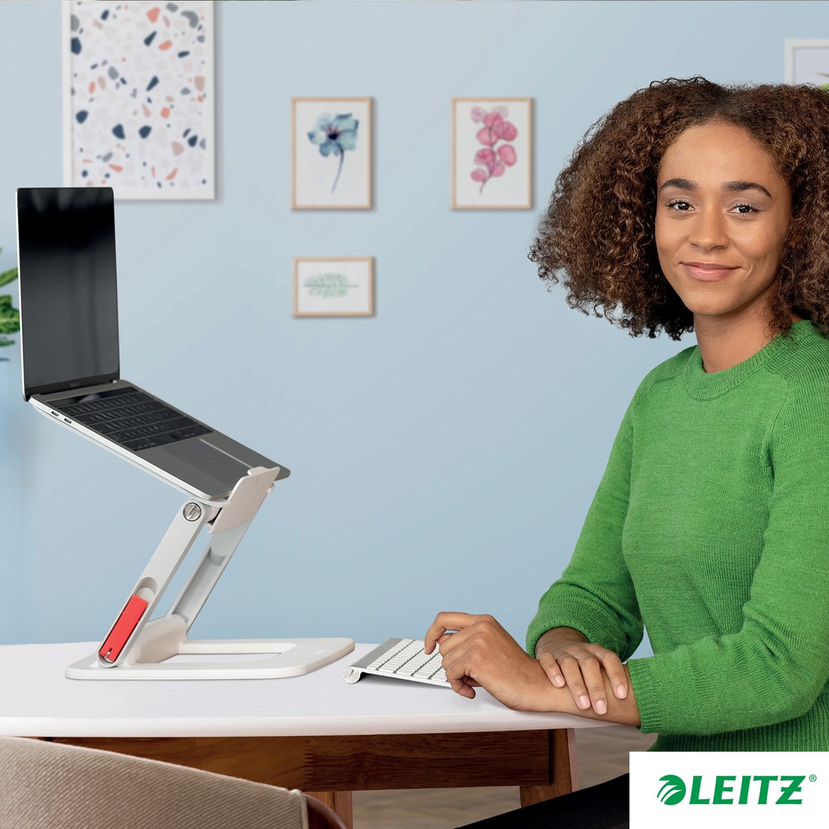 Leitz Ergo Multi-Angle Laptopstativ höjer skärmen på din laptop till den perfekta ergonomiska höjden, för att göra det mer bekvämt att titta in i skärmen och för att hjälpa till att förbättra din hållning. Olika höjd- och vinkelkombinationer, inklusive horisontell anpassning, med ett litet fotavtryck för kompakta skrivbord. Produkten är tillverkad av 63 % återvunnen plast och kan demonteras genom att metalldelar separeras från plast för 100 % återvinning - hög kvalitet och lång livslängd för att bidra till att bevara jordens resurser. Ett laptopställ främjar också luftflödet och håller batteriet och andra komponenter svala för att upprätthålla höga prestandanivåer. Med den minimalistiska designen och de matta färgerna kommer laptopstativet att förbättra hälsan och välbefinnandet genom att enkelt skapa en aktiv arbetsplats. Kombinera med andra Leitz Ergo produkter för att skapa en inbjudande och flexibel arbetsplats som håller dig i rörelse hela dagen.
