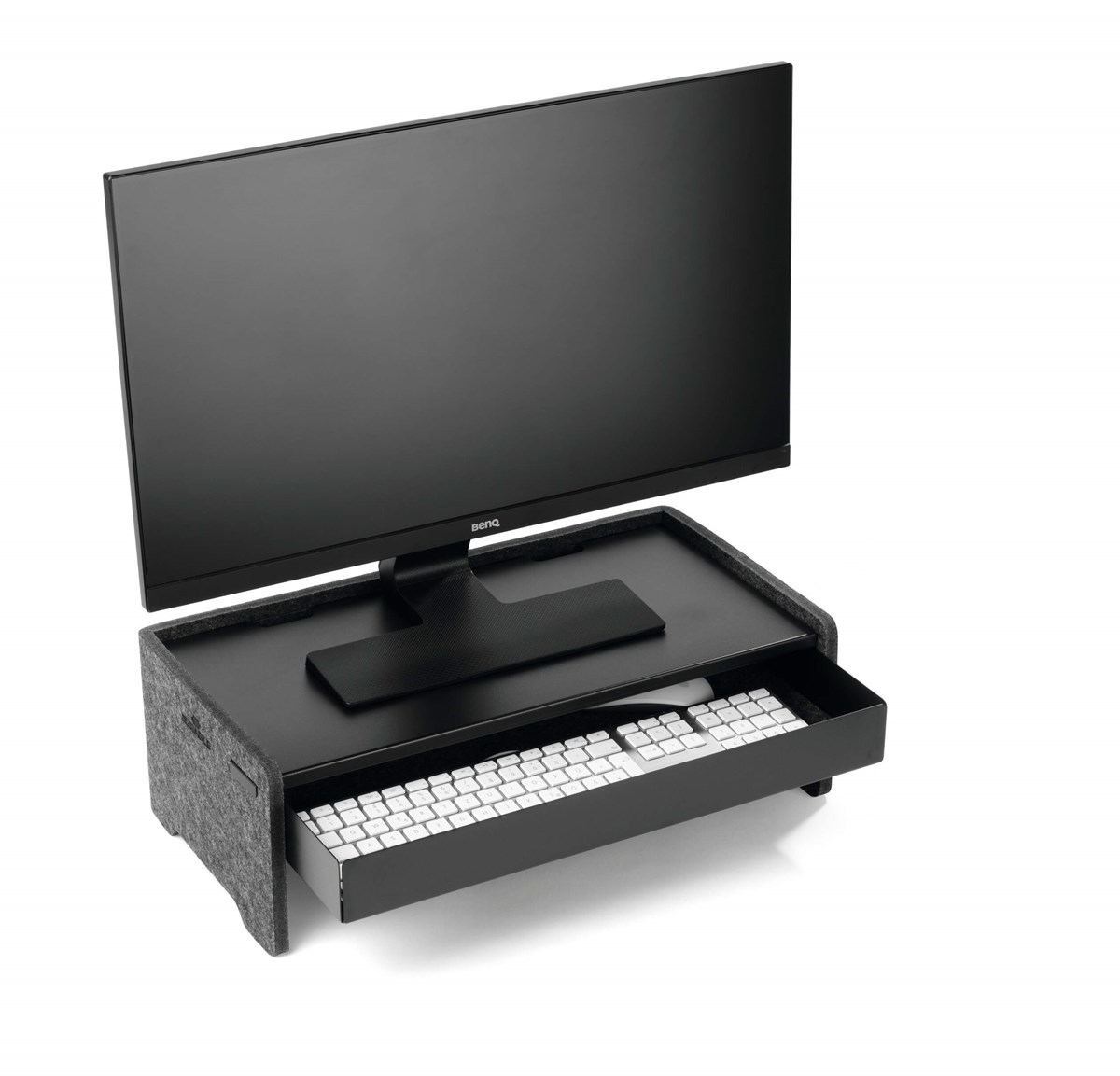 Med ett skärmställ hamnar datorskärmen på en bra ergonomisk höjd samtidigt som det frigör bordsyta. Kombinera med en låda för förvaring av pennor, dokument, kablar mm.