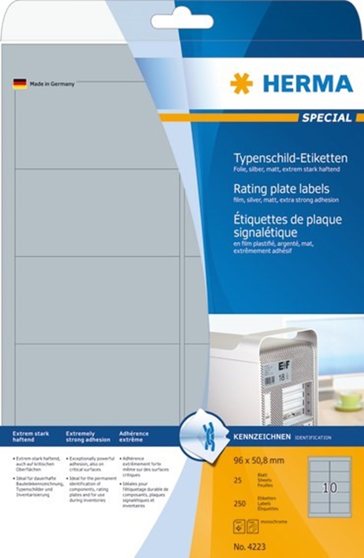 Silverfärgade folietiketter av hög kvalitet med glanseffekt för ett särskilt elegant utseende, olje- och smutsavvisande, avtvättbara. Idealiska som jubileums- och festetiketter, personliga presenter och representativa produktetiketter. För laser och kopiering. A4-ark.