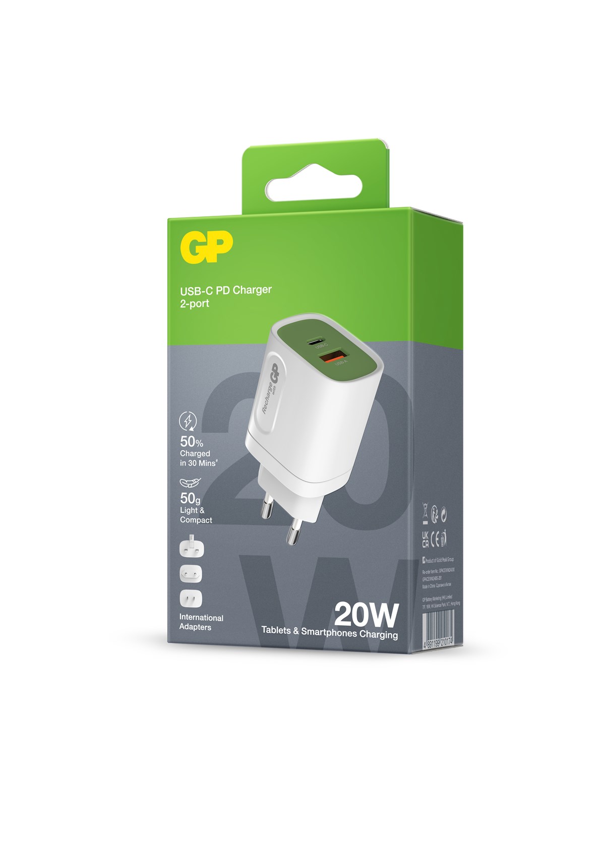 GP 20 W PD-laddare laddar upp till tre gånger snabbare än standardladdare och kan ladda telefonen till 50 % på endast 30 minuter. De dubbla USB-C- och USB-A-portarna gör det möjligt att ladda två enheter samtidigt. Laddaren kommer i ultralätt utförande och med reseadaptrar för smidig laddning överallt. De många säkerhetsfunktionerna förhindrar överspänning, överström och kortslutning.