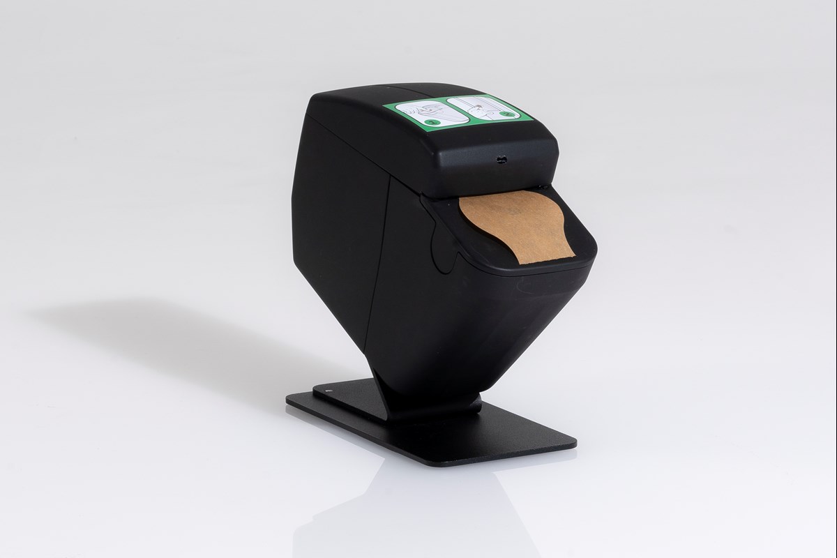 För en komplett lösning behövs även pappersrullar som matas fram ur dispensern (köps separat). Tryck ner pekfingret i hålet (den svarta markeringen på pappret) så appliceras skyddet på fingret. Dispensern körs via 6 volts eller eller via 4 st C-batterier (professionella batterier rekommenderas). Mått: 210x165x86 mm (utan fäste).