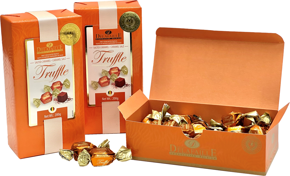 Belgiska tryfflar med smak av salt karamell inslagna i orange presentpapper.