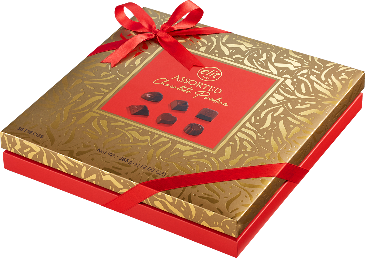 En röd och gyllene chokladask med rosett, innehållande goda chokladpraliner.
