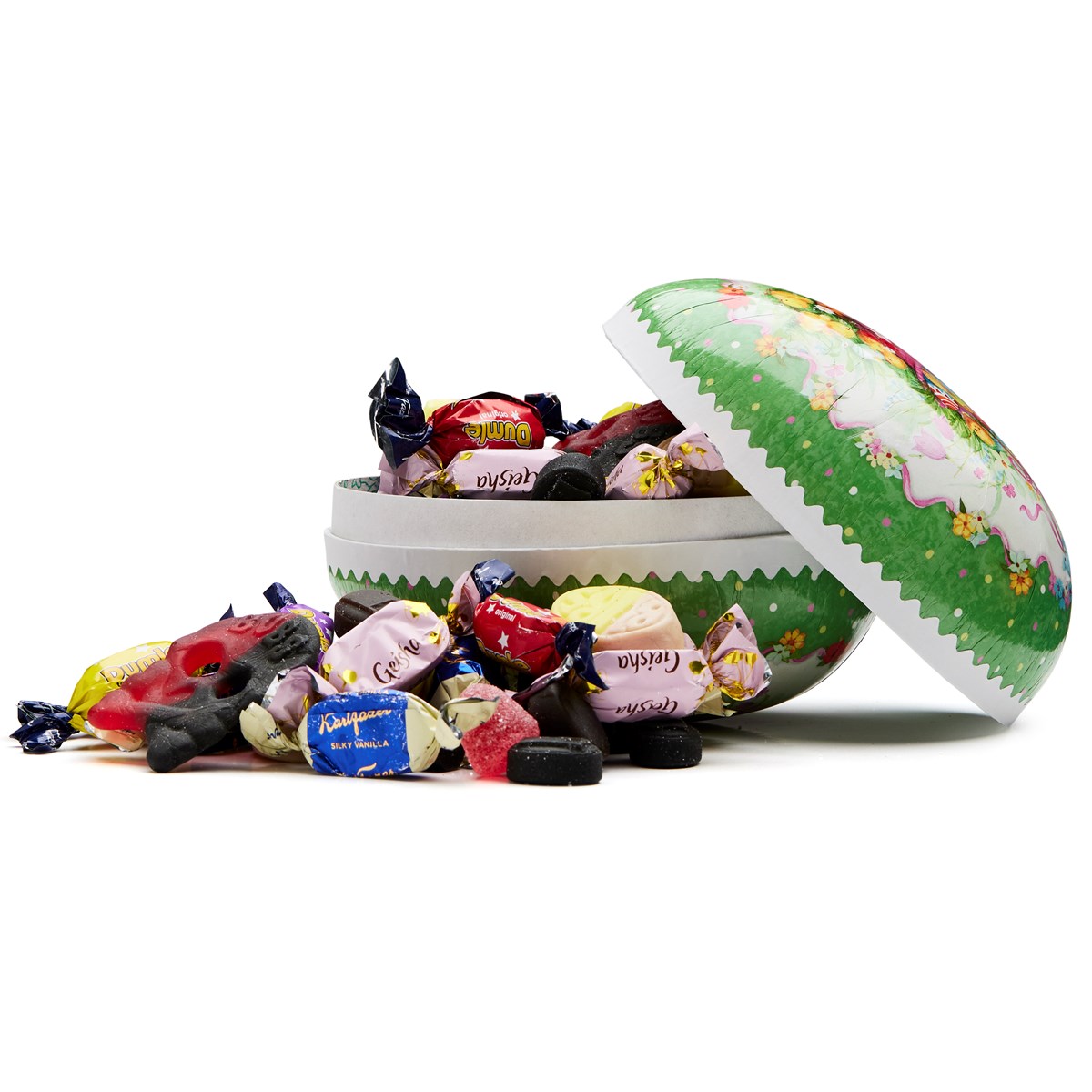 Våra pappersägg finns i fem olika storlekar och fylls med en salig blandning av klassiker från kända märken mixat med sådant vi känner igen från lösgodisdisken. Noga utvalda godisfavoriter med nostalgi och barndomsminnen, samtidigt som de erbjuder tidlösa smaker som uppskattas av alla åldrar. De levereras med påskkort eller sleeve runt ägget med ett av våra utvalda påskmotiv.