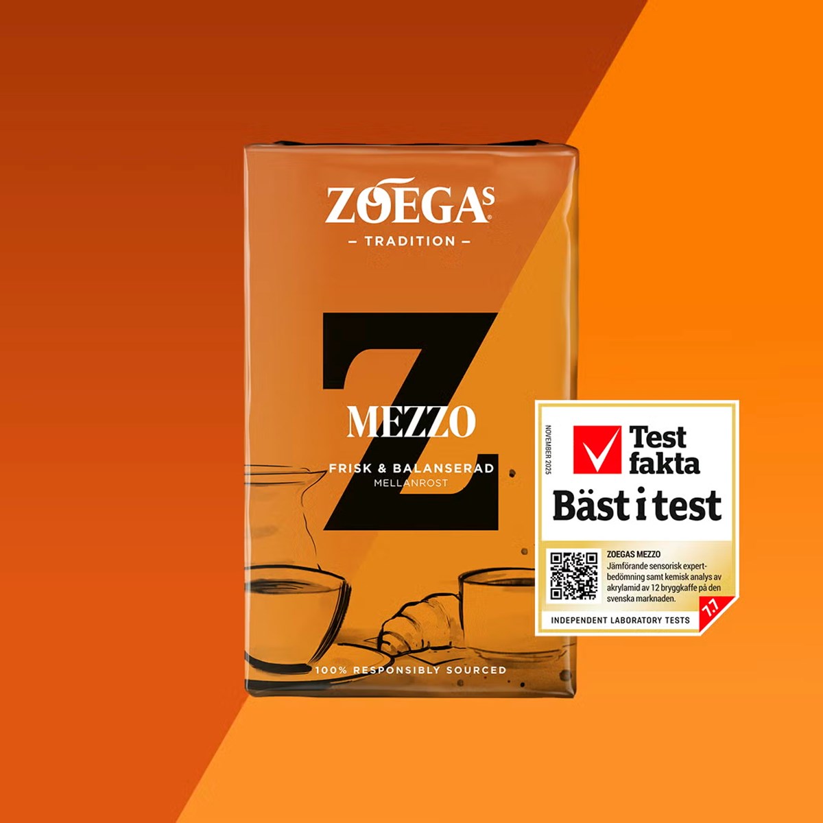 Zoégas Mezzo malet kaffe får högst betyg i Testfaktas mellanrost-test – med kommentaren ”Bäst i test. Trevligt och aromatiskt kaffe med bra helhetsintryck och eftersmak. Låga nivåer av akrylamid.”.