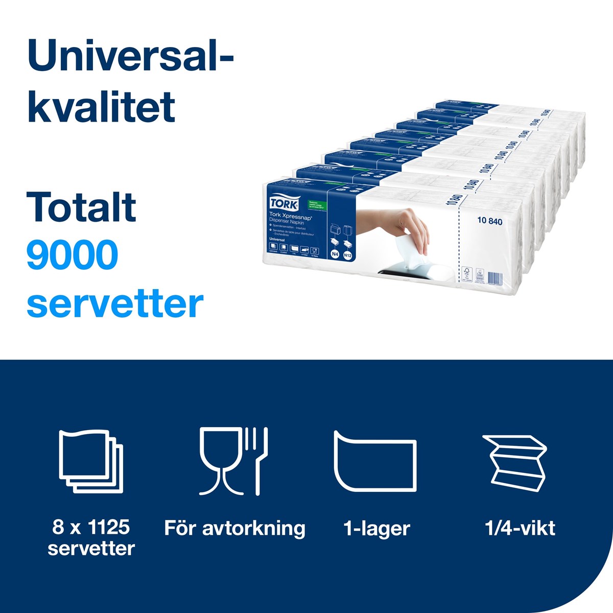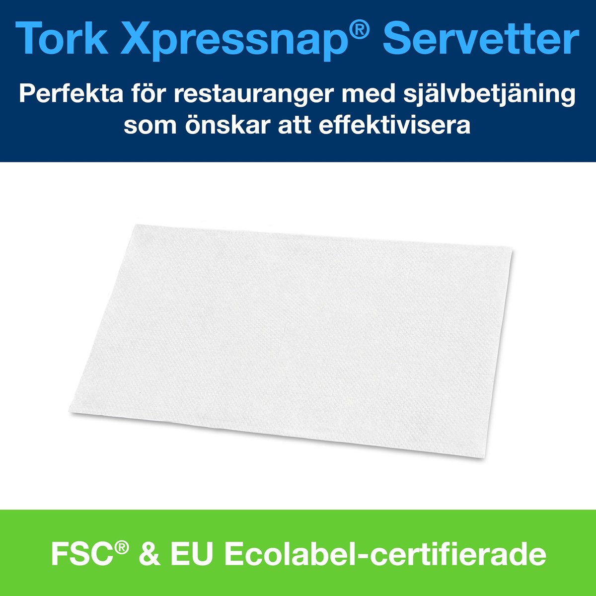 Tork Xpressnap® Servettdispenser är ett utmärkt val för restauranger med självbetjäning. Med detta system kan du minska förbrukningen med 25 % jämfört med traditionella servettdispensrar. De vita dispenserservetterna Tork Xpressnap® (1-lagersservett) passar perfekt på välbesökta restauranger där det är viktigt att hålla nere kostnaderna. Kvalitet Universal. 1/4-vikta. Format: 21,3 x 33 cm. 1125 st/förp. 8 förp./kartong.