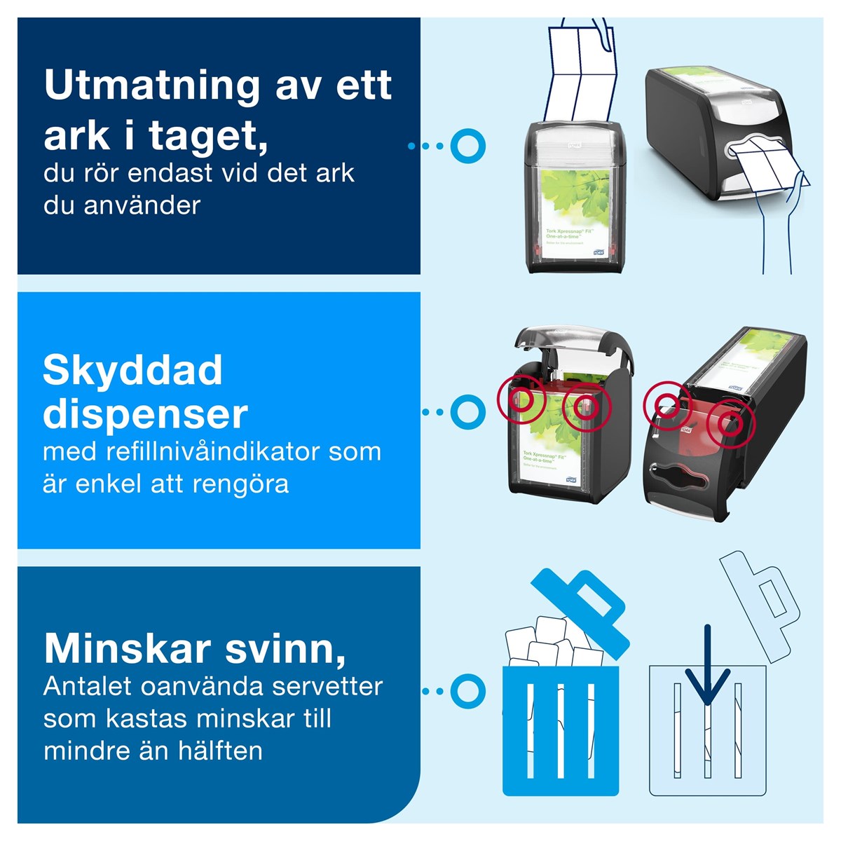 Kompakt dispenser som rymmer fullstora servetter och tar liten plats på bordet Refillindikatorn visar när det är dags att fylla på dispensern Den kompakta refillförpackningen minskar behovet av lagerutrymme Reklamfönster