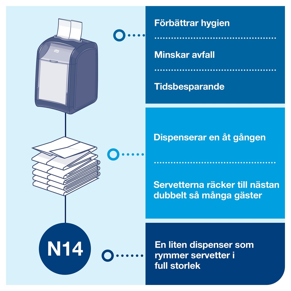 Kompakt, toppmatad dispenser som matar ut en servett i taget vilket minskar förbrukningen och avfallet. Utmärkt för bord och diskar. Placera eget budskap i reklamrutan. Enkel påfyllning och refillindikator som visar när det är dags att fylla på nya servetter. Rymmer 168 st N14-servetter. Format: L14,1 x B11,3 x H17 cm.