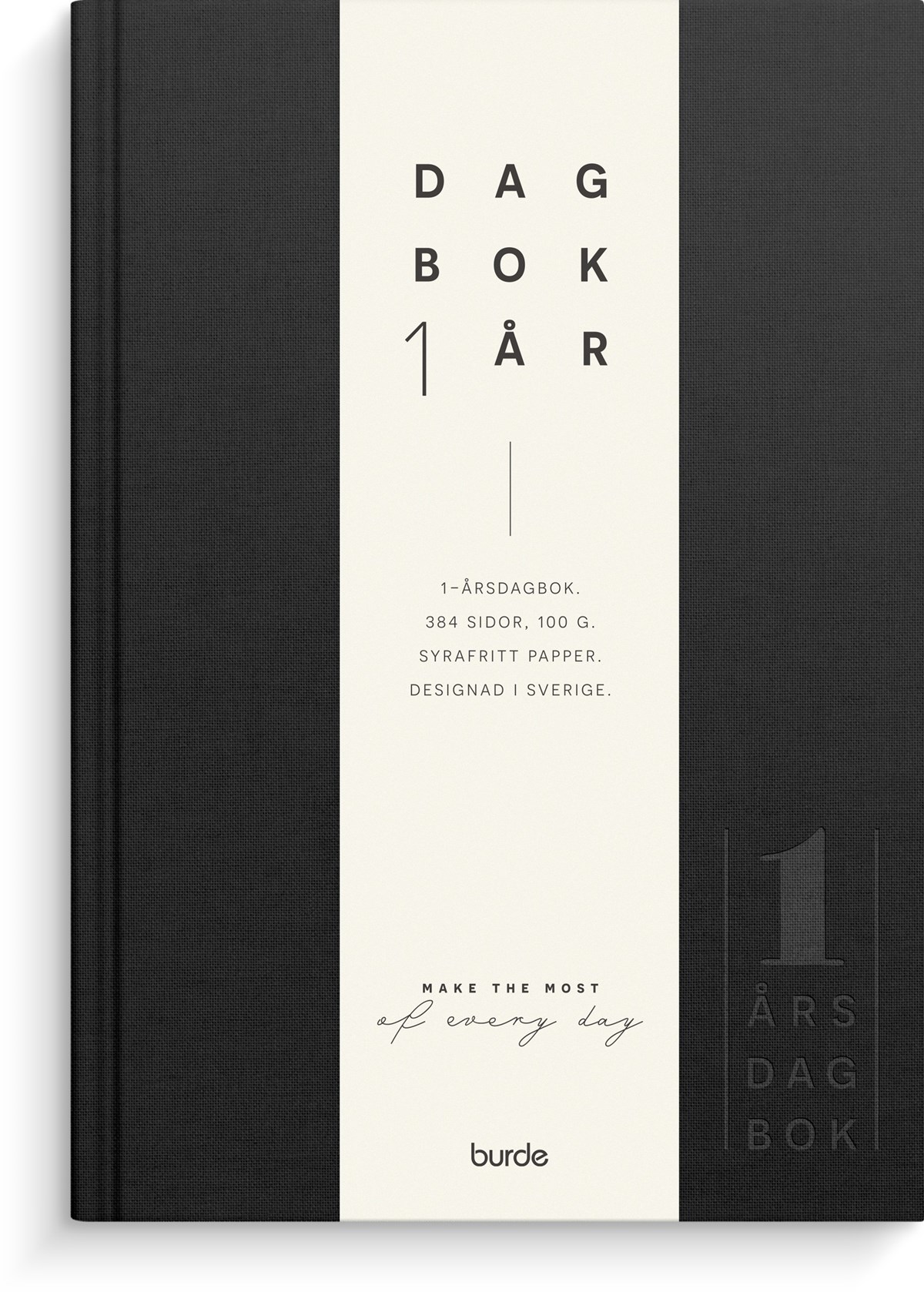 Format: 142x205 mm. Layout: Dag/sida. Omslag: Linnetextil. Inbunden. Detaljer: Märkband. Innehåll: Årsplan, namnsdagsregister. Antal sidor: 384. Pappersvikt: 100 g. Miljöinformation: FSC. Varumärke: Burde.