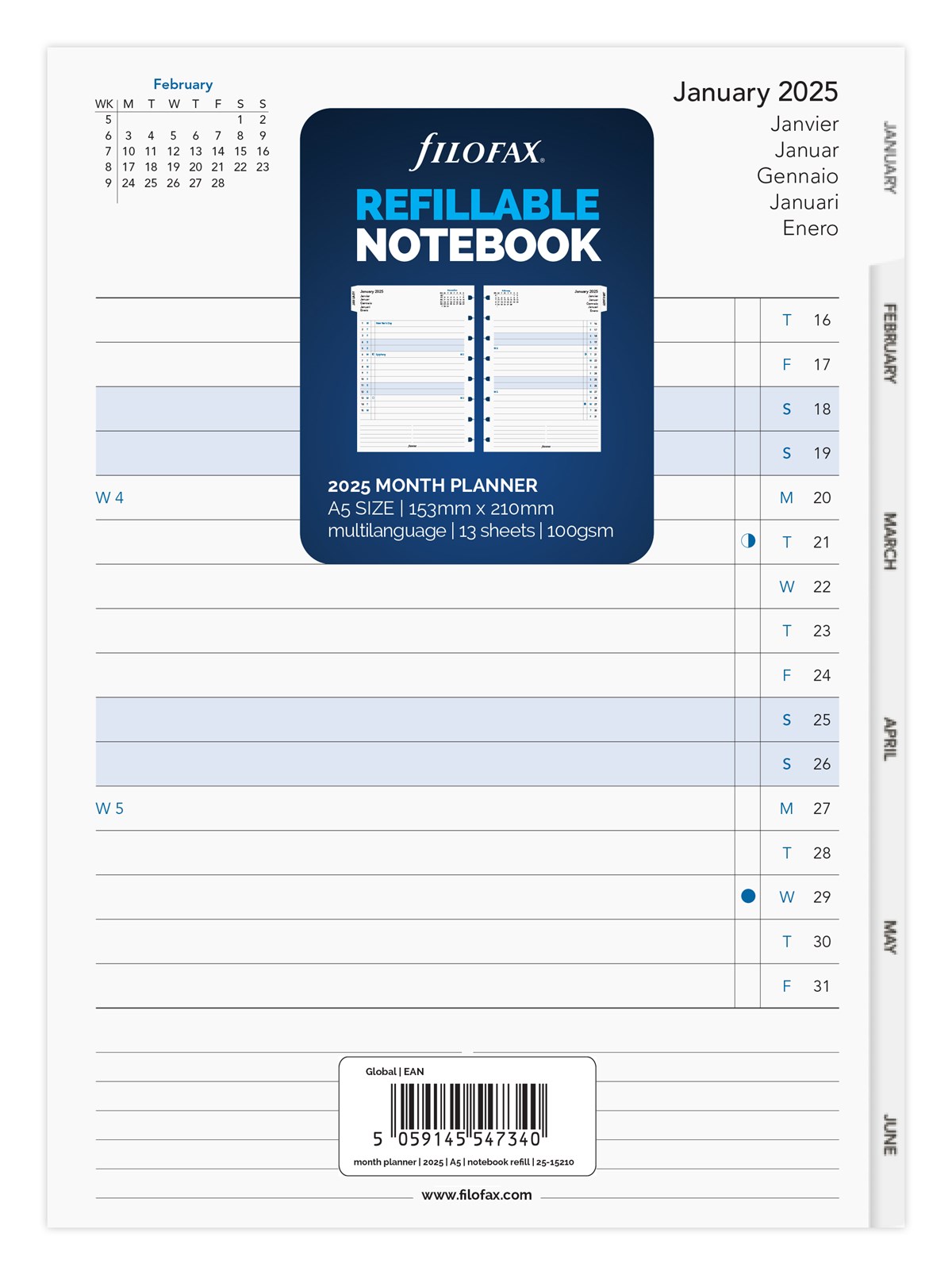 Fyll på med ark i Filofax anteckningsbok så den aldrig tar slut. Varför inte sätta in en månadsplan med plats för några fler anteckningar.