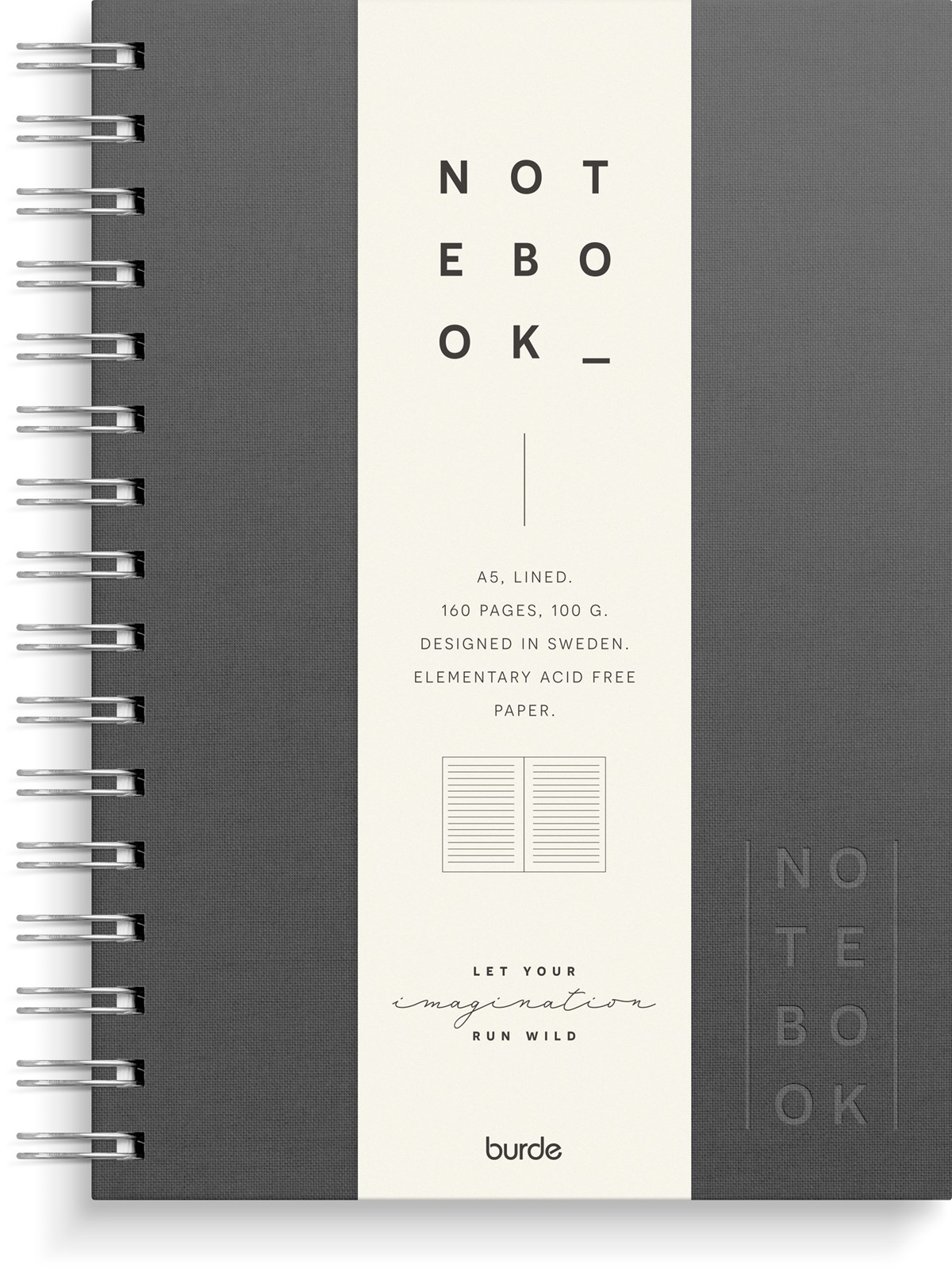 Format: A5. Layout: Linjerad. Omslag: Linnetextil. Spiralbunden. Antal sidor: 160. Pappersvikt: 100 g. Miljöinformation: FSC-papper. Varumärke: Burde.
