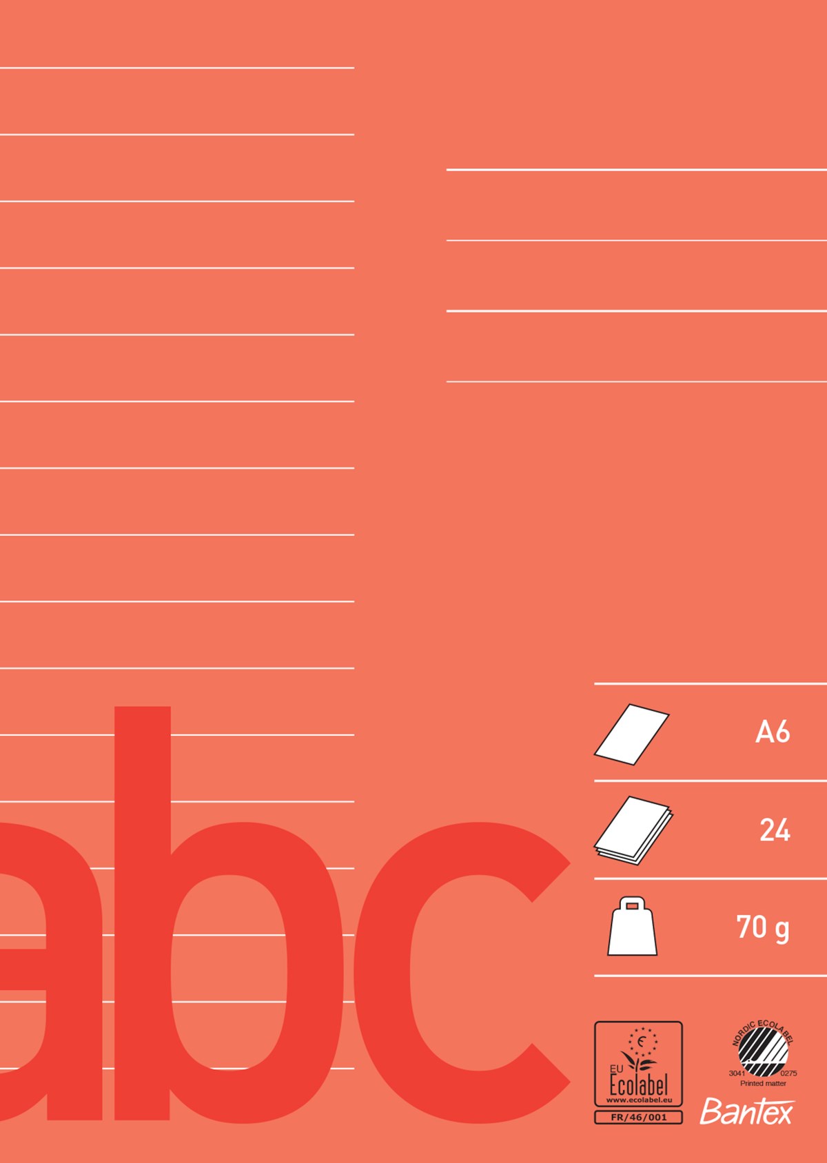 Tillverkat av 70 g Svanenmärkt papper. 24 blad. Linjerat 7 mm.
