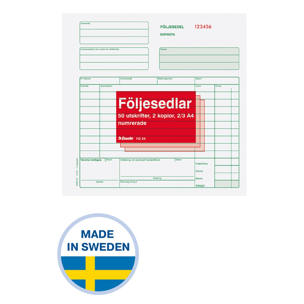Svensktillverkade följesedlar i format 2/3 A4. Tillverkade i ISO-certifierad fabrik i skånska Göingebygden. Råvaror från Sverige och Tyskland. Numrerade följesedlar med två (2) kopior per set. Självkopierande papper. 3 x 50 blad.