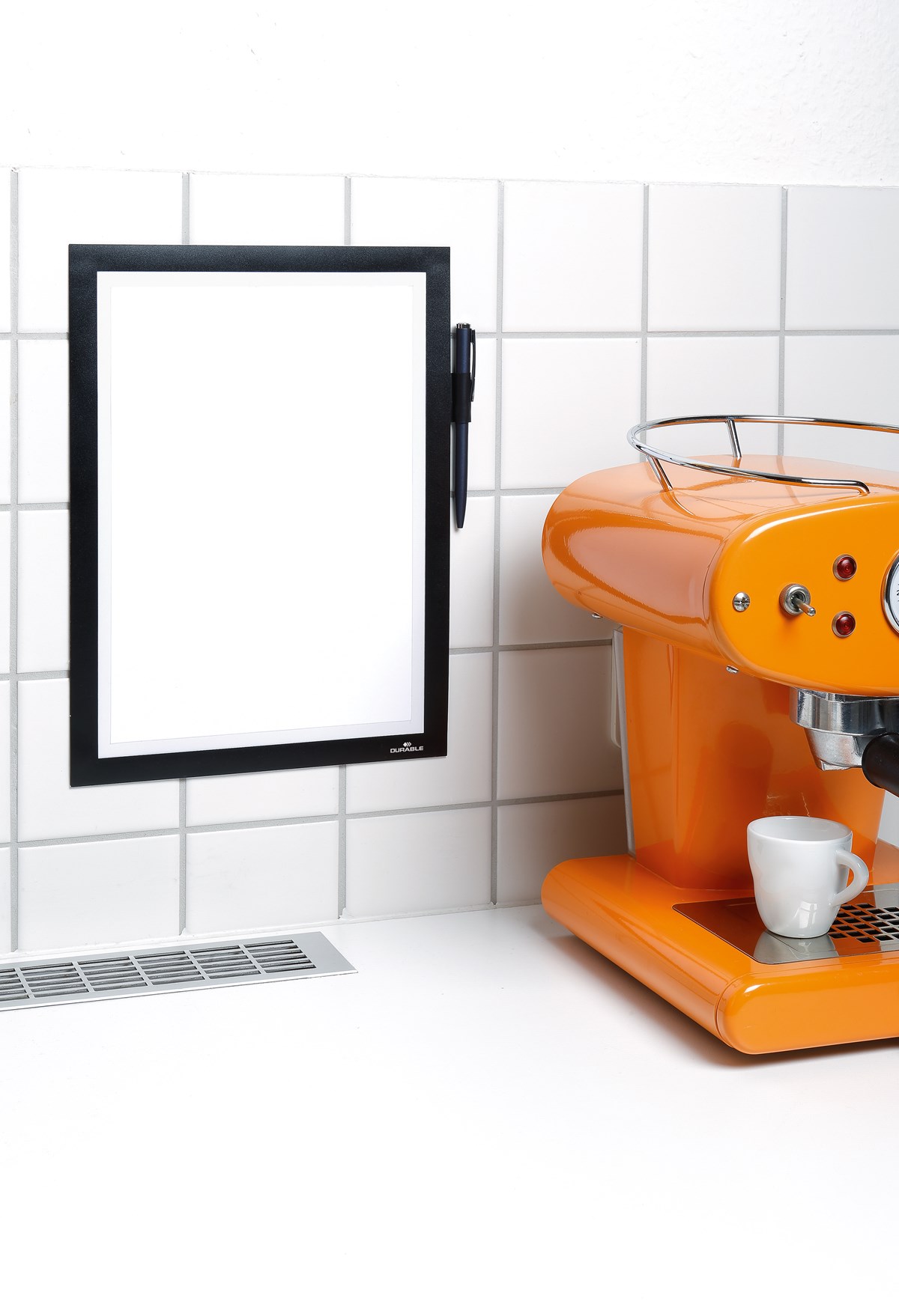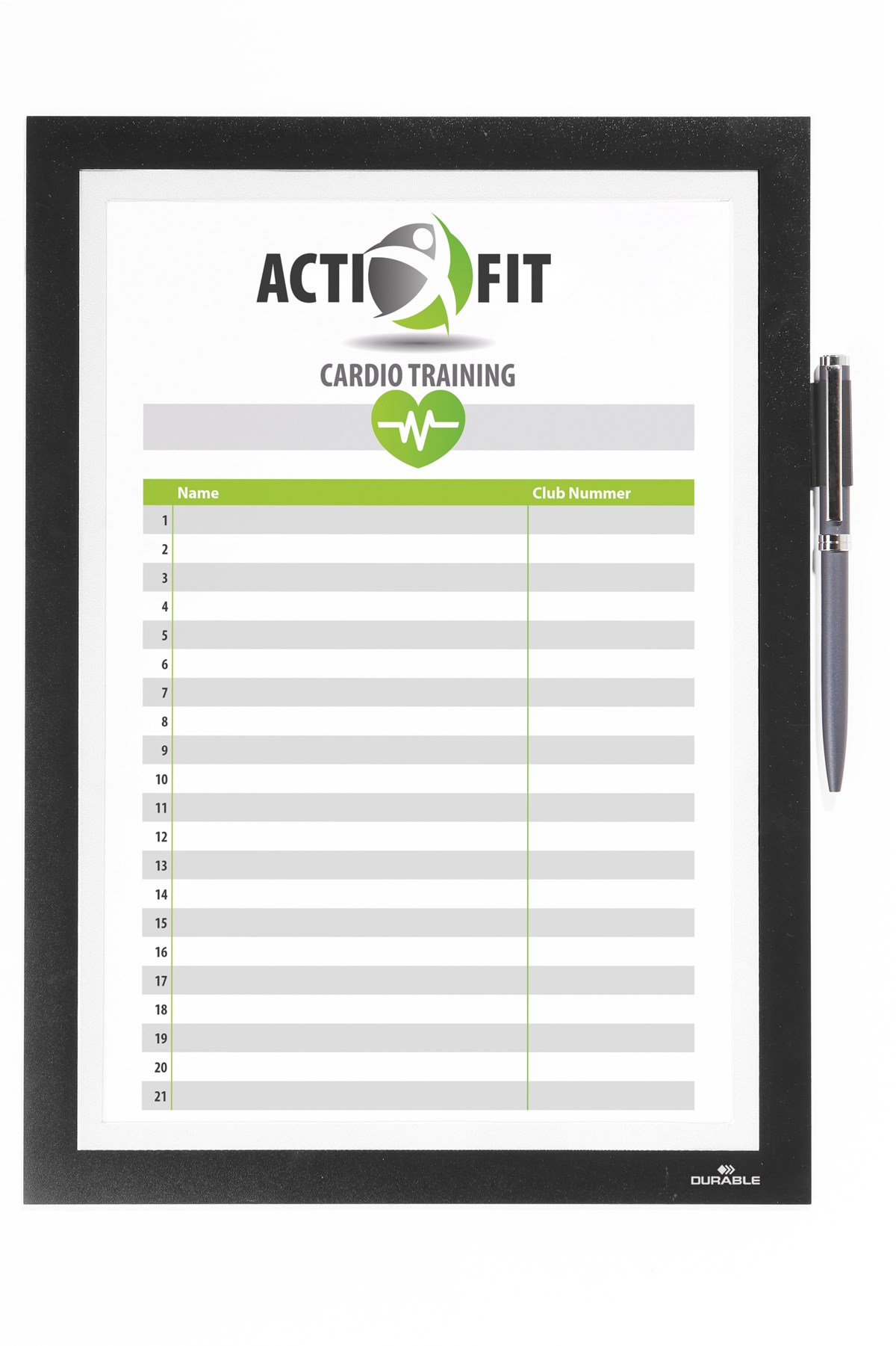 Öppen framsida vilket gör det möjligt att skriva direkt på pappret utan att behöva ta ut det först. Perfekt för t.ex. städscheman, registrerings- och checklistor. Fäster på släta ytor och kan tas bort från glasytor. Med hållare för pennor med clips. Plats för upp till 5 st A4-ark. för stående och liggande format.
