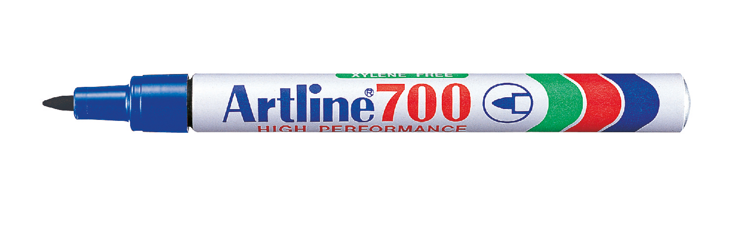 Pennkropp av aluminium och härdad akrylspets. Lämplig på metall, glas, plast, porslin, trä, textil, folier (röntgenfilm m.m.). Mycket snabbtorkande. 0,7 mm spetsbredd. 12 st/förp.