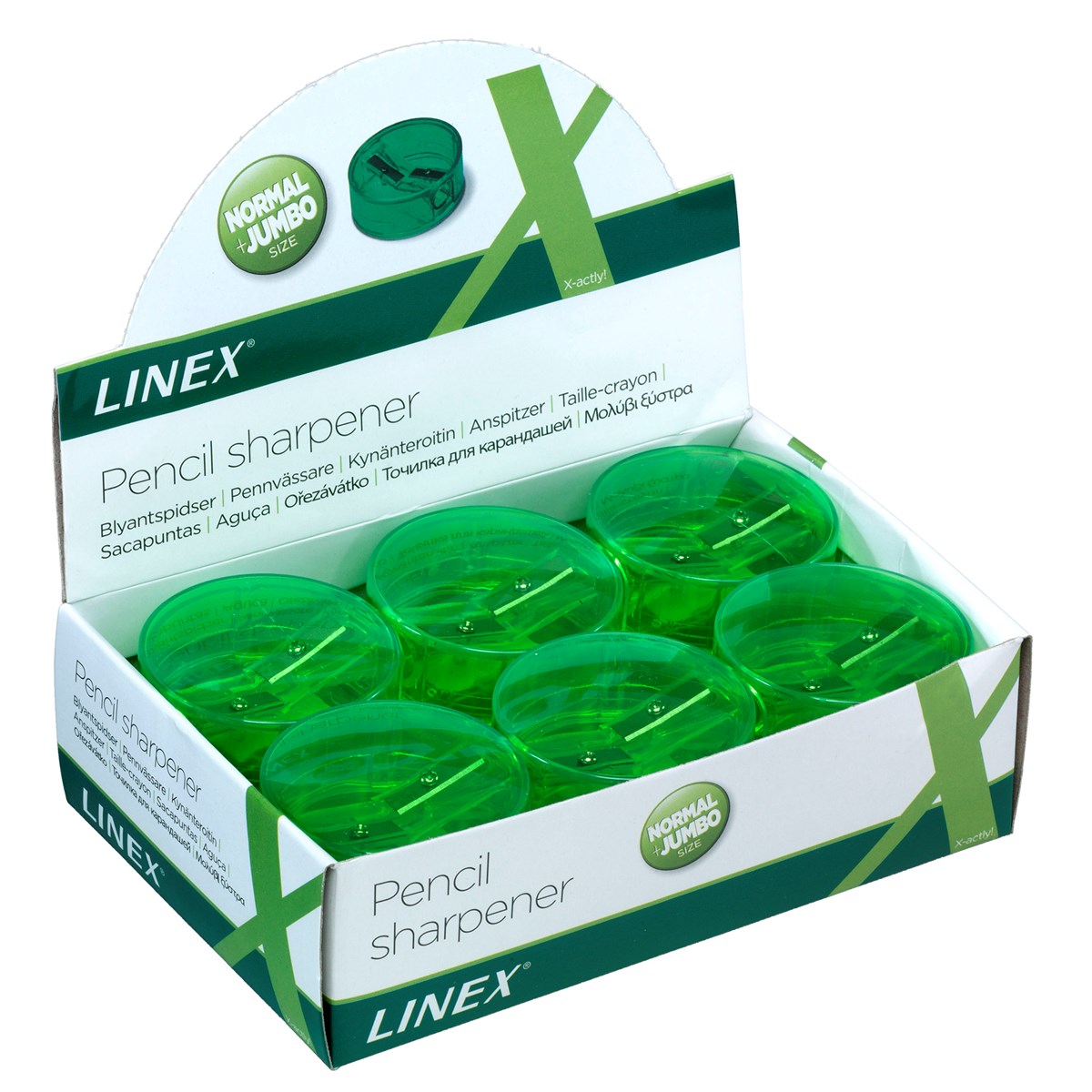 Pennvässare av transparent plast med behållare med 2 hål för vanliga blyertspennor och jumboblyertspennor, trekantiga, runda eller sexkantiga. Pennvässarens hål kan låsas för att undvika att avfallet ryker ut.