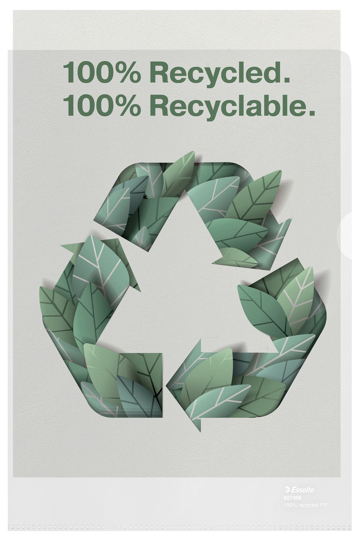 Miljövänlig A4-dokumentmapp tillverkad av 100% återvunnen plast (industriavfall/restmaterial eller produktionsrester: externt testad av UL). För att skydda dokument när du är på språng och för att organisera papper på jobbet och hemma. Produkten kan återanvändas och återvinnas igen. Den är förpackad i en kartong som också är 100% återvunnen och återvinningsbar. Tillverkad i Europa.