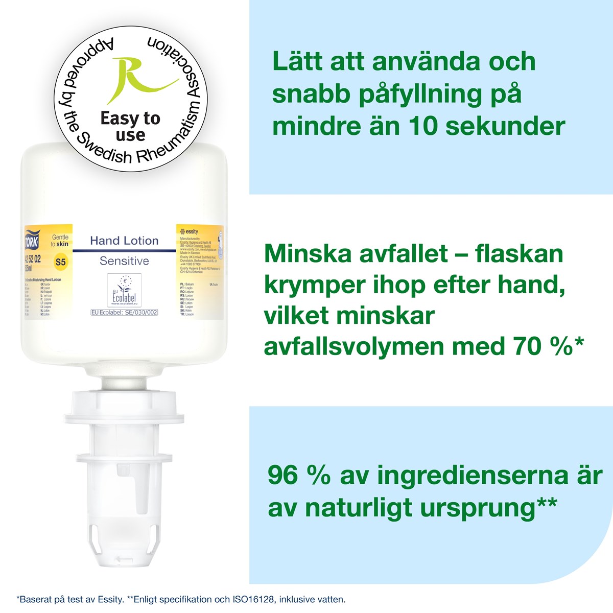 - Oparfymerad lotion - Gör att huden känns mjuk och len - Snabbabsorberande - Dermatologiskt testad - Hudvänligt pH - 96 % av ingredienserna är av naturligt ursprung (enligt specifikation och ISO16128, inklusive vatten) - Snabb påfyllning på mindre än 10 sekunder - Fabriksförseglad flaska med en ny pump för varje påfyllning bidrar till att minska risken för smittspridning - Flaskan krymper ihop efter hand, vilket minskar avfallsvolymen med 70 % (baserat på test av Essity)
