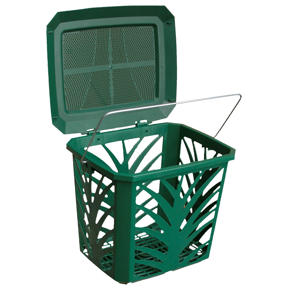 Perforerad 6-liters behållare med ventilerade sidor och lock för maximal ventilation runt om gör att fuktigheten dunstar bort och avfallet torkar. Hygienisk uppsamlingsränna för eventuellt kondensvatten. Skruvhål för montering på dörr. Tillverkad i återvunnen plast.