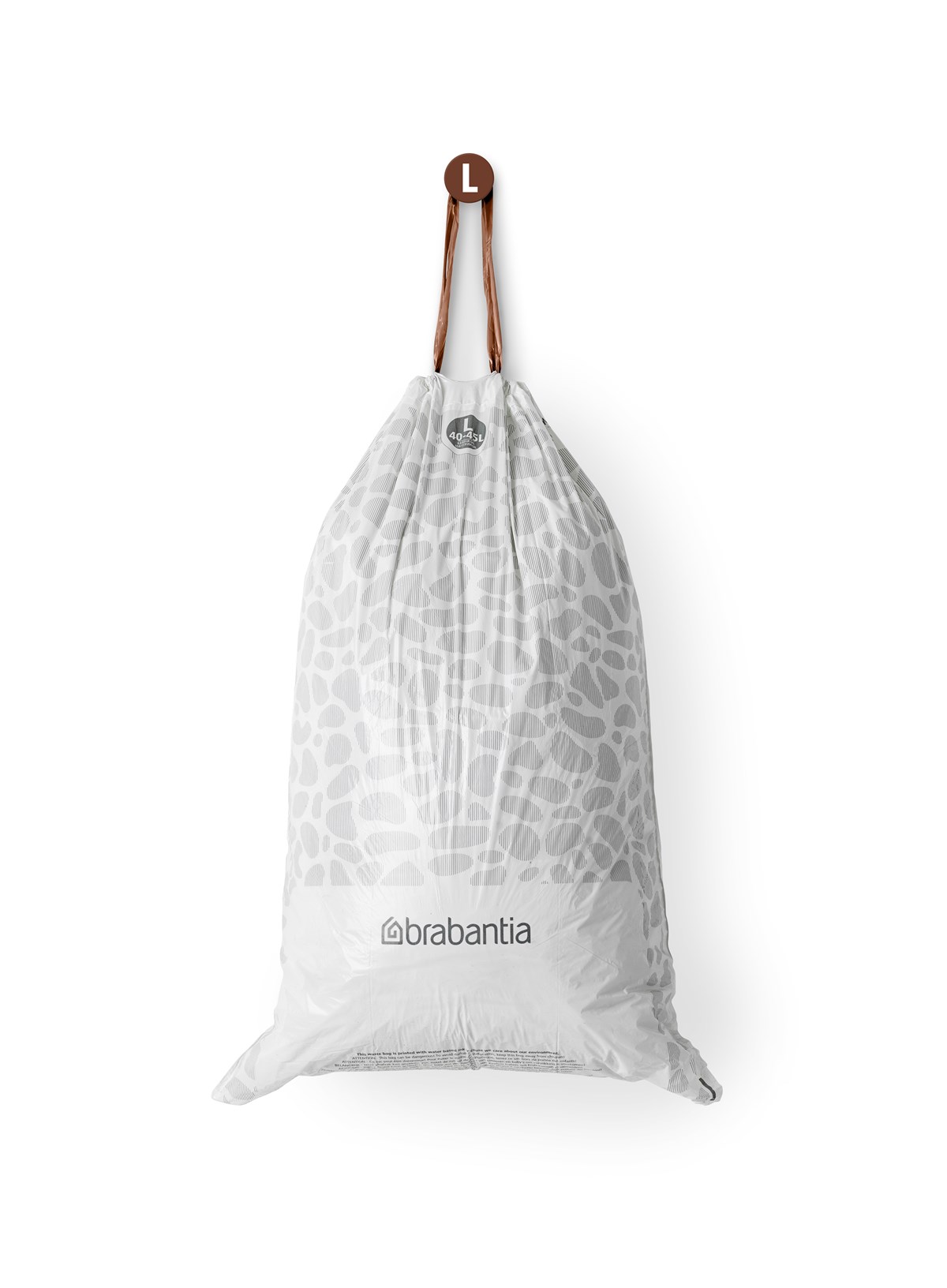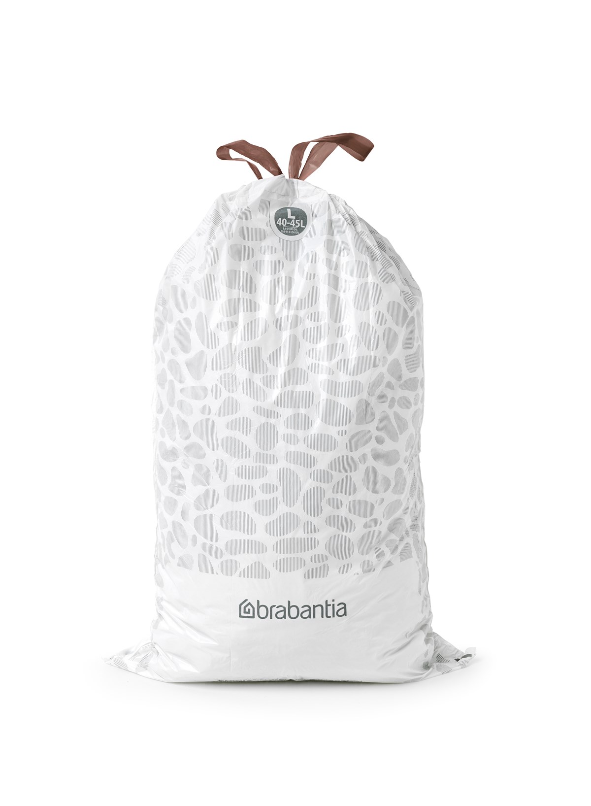 Brabantia PerfectFit avfallspåsar passar perfekt till din Brabantia avfallshink. De är extra starka och har det praktiska knytbandet! Dra bara i det för att ta påsen ur avfallshinken och försegla den. Är du inte säker på vilken storlek du behöver? Kontrollera helt enkelt färgkoden på insidan av avfallshinkens lock.