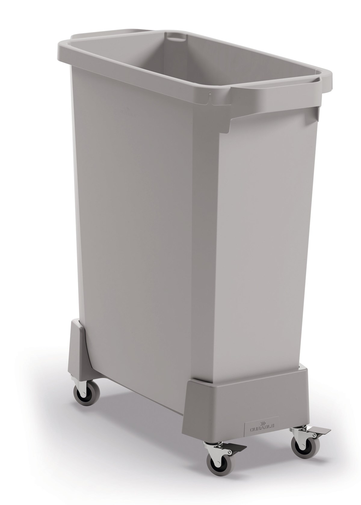 Själva bottenplattan är tillverkad av 100% återvunnen polypropylenplast, vilket gör att produkten inkl. hjul totalt sett är tillverkad av 50% återvunnet material. Detta går i linje med DURABLEs hållbarhetsstrategi RETHINK som fokuserar på att minimera miljöpåverkan genom att designa produkter som är funktionella och hållbara samt tillverkade med omtanke om resurser och återanvändning. Tål fukt, vilket underlättar vid rengöring. Länkhjulen har en diameter på 50 mm och två av dem har broms. Belastningsbar upp till 80 kg. Mått inkl. hjul: 240 x 165 x 495 mm (BxHxD).