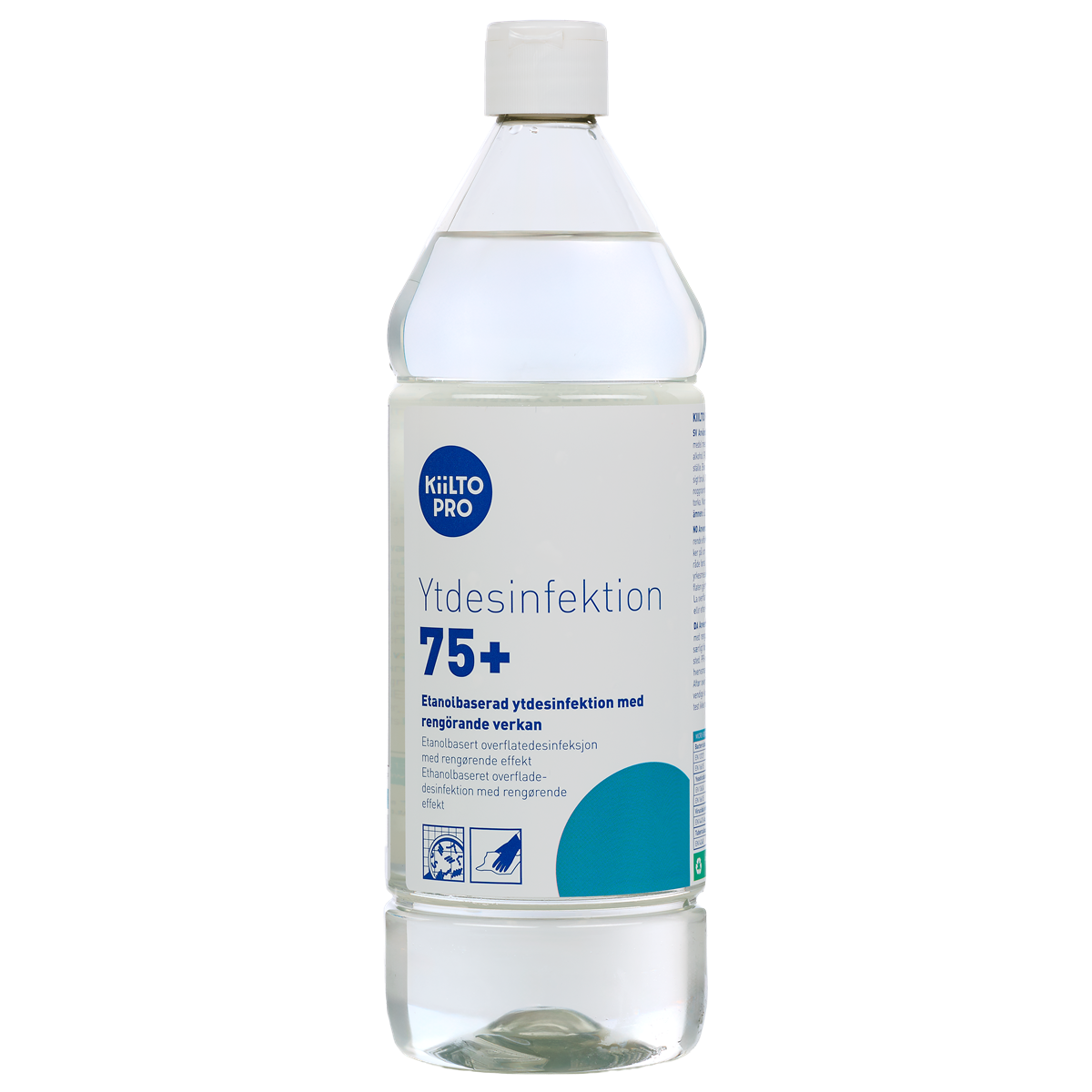 Kiilto Pro Ytdesinfektion 75+ är baserad på 75 vol% denaturerad etanol samt tensid (smutslösare) och avsedd för desinfektion av släta ytor t.ex. bänkar, bord och undersökningsbritsar. Den är effektiv mot bakterier, jästsvamp och olika typer av virus som coronavirus, HIV, Hepatit B och C samt vissa nakna virus som Adenovirus och Murine Norovirus. Produkten verkar snabbt och effektivt utan att lämna spår på den behandlade ytan.