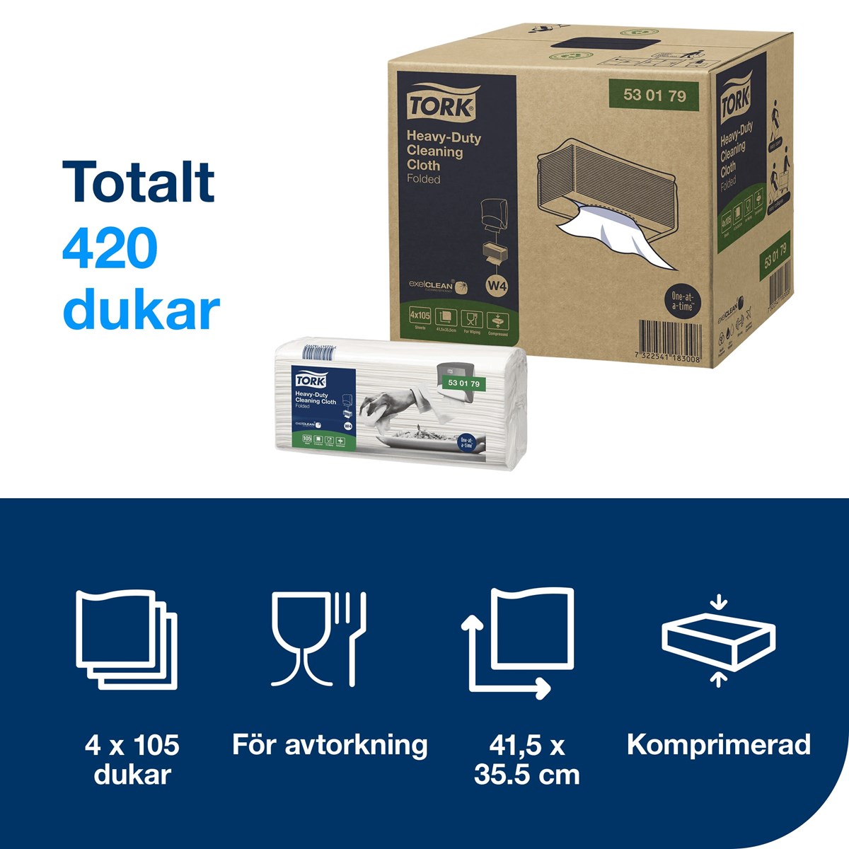 Industriella utrymmen behöver slitstarka rengöringsdukar som kan hantera olika uppgifter. Dessa kraftiga dukar hanterar effektivt olja och fett, och skyddar samtidigt händerna från värme och metallspån. Utmatning av en duk i taget minskar avfallet och förpackningen är tillverkad av återvunna material för en extra miljövänlig boost. 1-lagers. Premium-kvalitet. Vikt storlek: D 10.8 cm B 35.5 cm. Ovikt storlek: D 41.5 cm B 35.5 cm. Passar med W4 dispensrar.