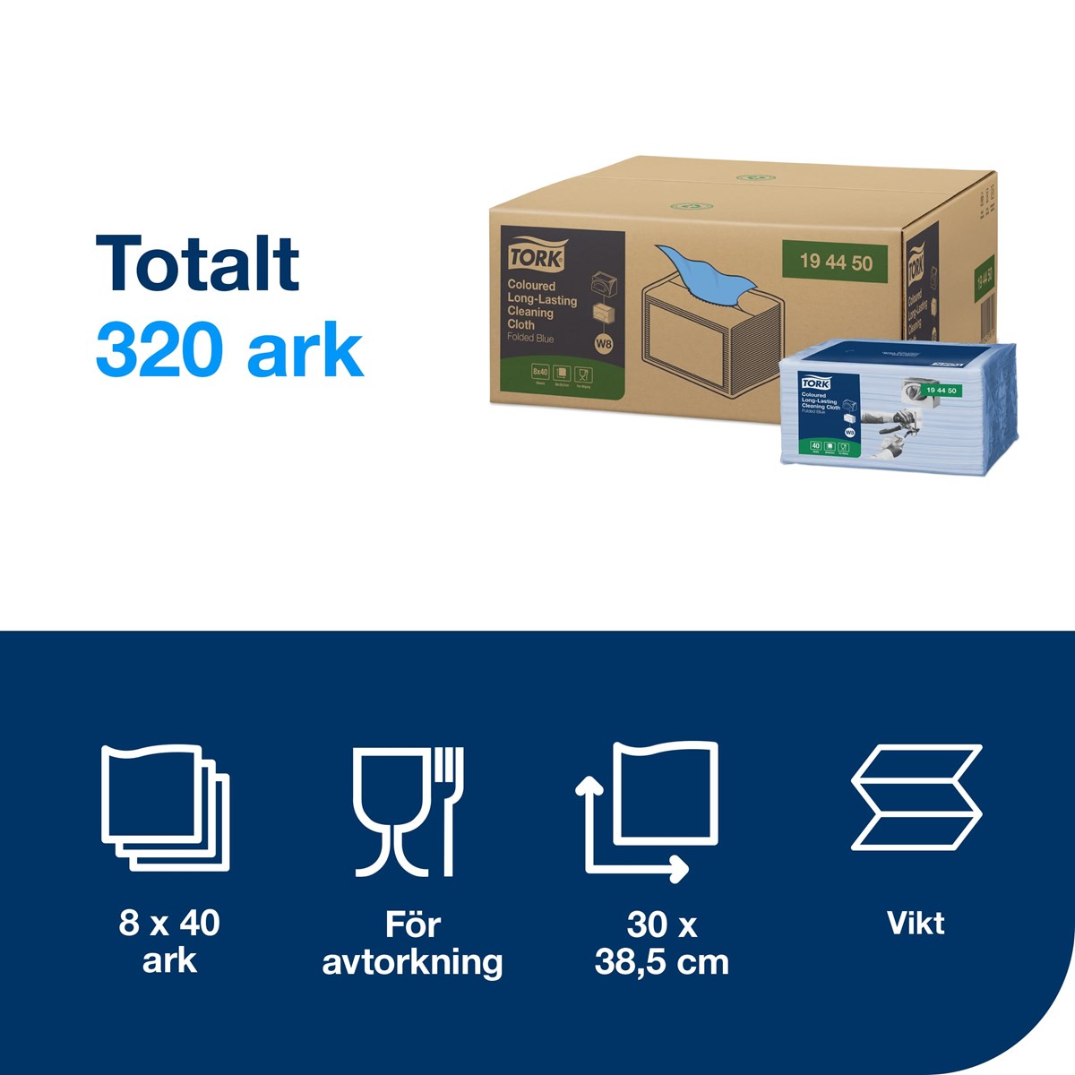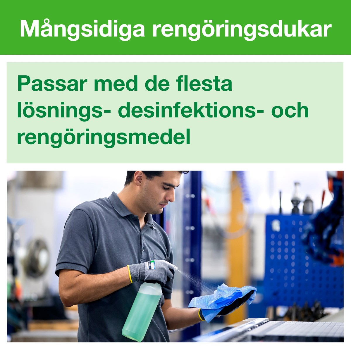 Allround-kvalitet som kan hantera allmän avtorkning Stark och absorberande Tillgänglig i fyra färger för att förhindra korskontaminering Lämplig för användning med de flesta rengöringsprodukter