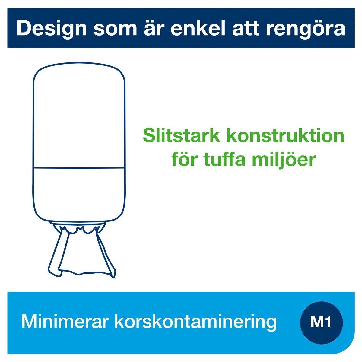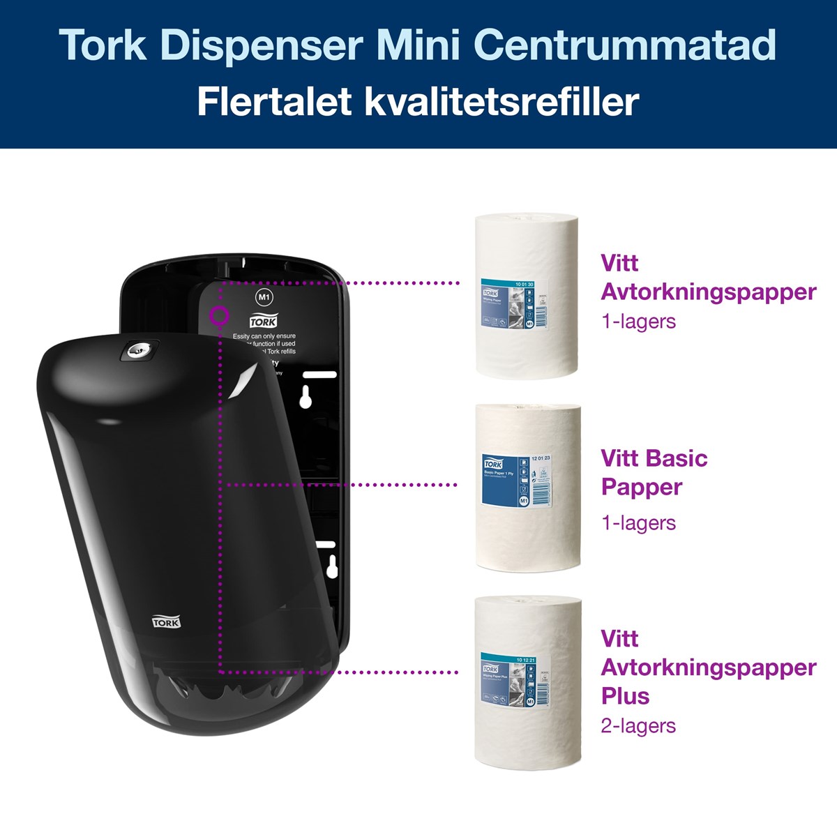 Smidig hållare i plast för centrummatade Mini M1-rullar. Starka tänder i rostfritt stål. Lätt att fylla på. Mått: (H x B x D) 32 x 17,4 x 16,5 cm.