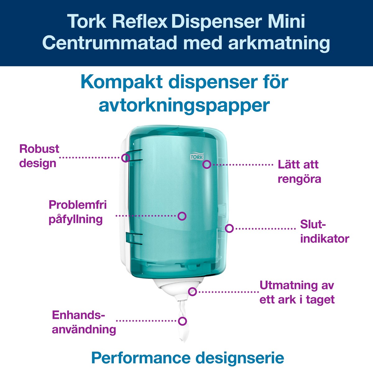 Minskar korskontaminering då användare endast vidrör det som de själva använder Hållbar, kompakt lösning som sparar plats Ekonomiskt arkmatningssystem Tork slutindikator möjliggör effektiv påfyllning