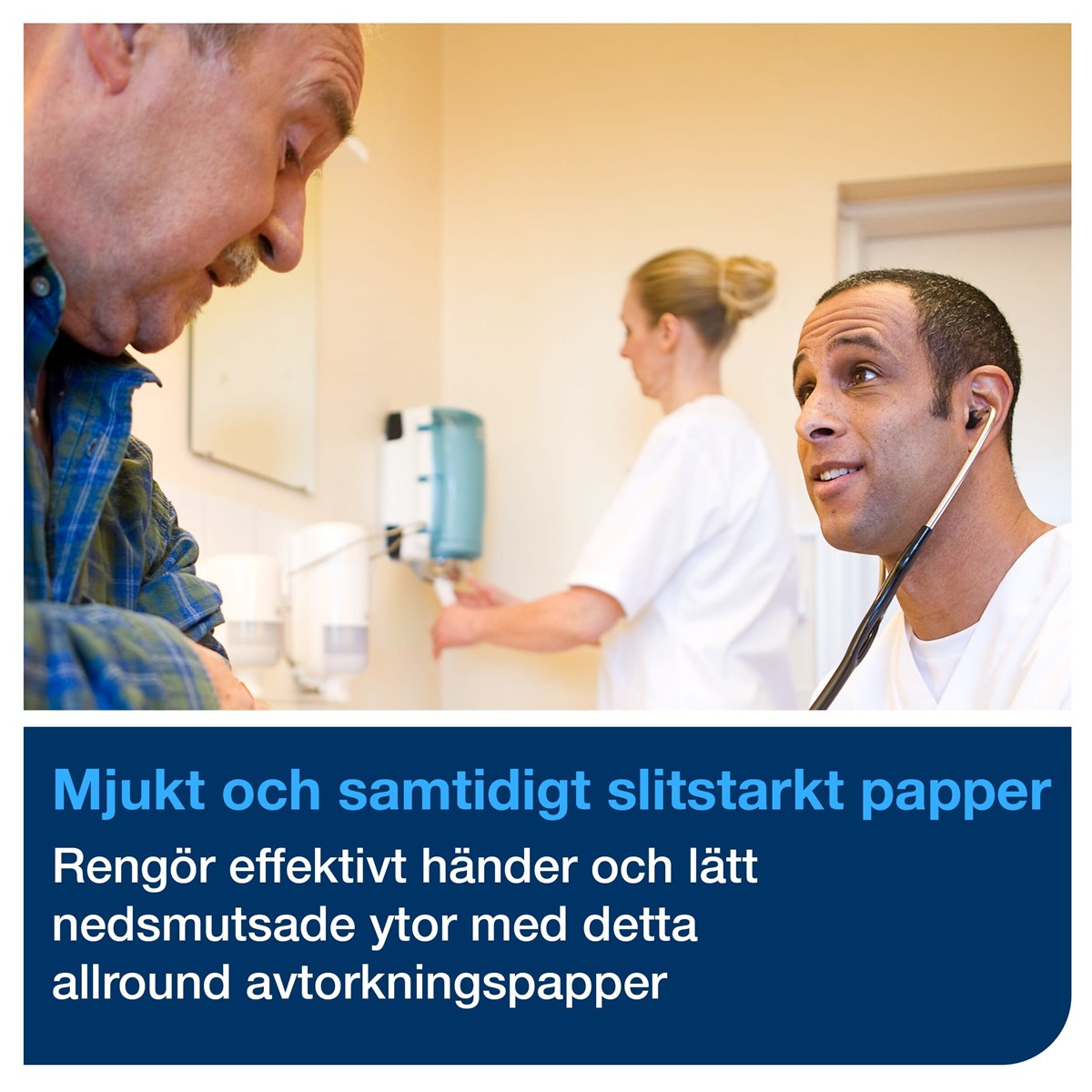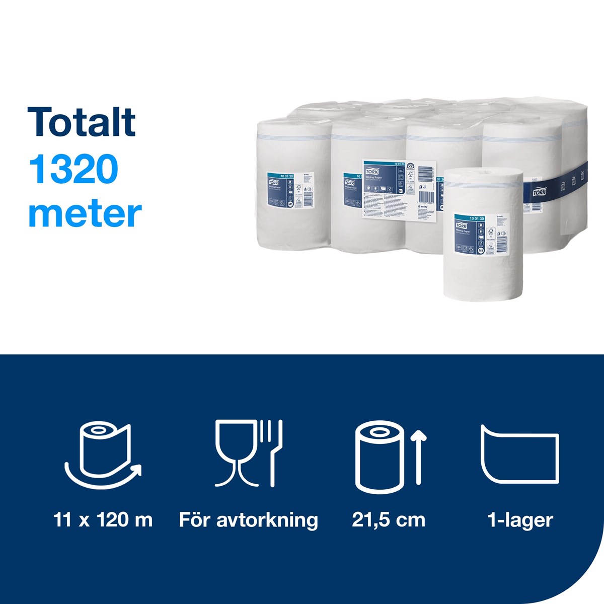 Våtstarkt, centrummatat papper. Passar perfekt för lättare avtorkning och handavtorkning. Har slutindikator – när det är 4 m papper kvar, syns blå linjer som talar om att det är dags att byta rulle. Godkänt för livsmedelskontakt. 1-lag. Passar till Tork hållare Mini M1. 120 m, bredd 21,5 cm, 0,6 kg/rulle. 11 rl/förp.