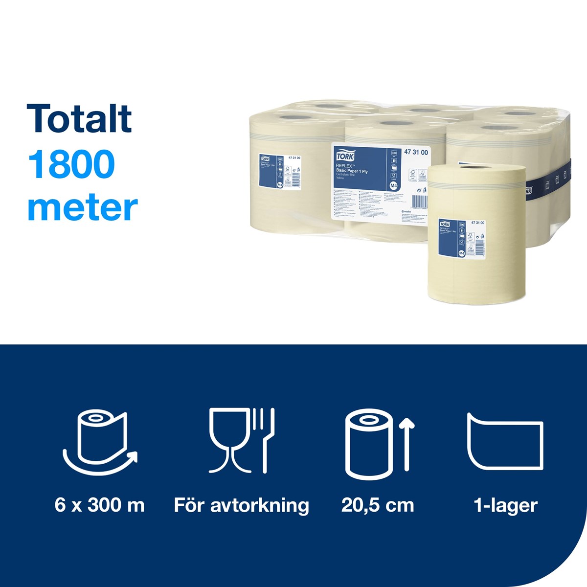 Perforerat, centrummatat gult papper. Matar ut ett papper i taget – minskar förbrukningen med upp till 37 %. Passar perfekt för lättare avtorkning och för handavtorkning. Har slutindikator – När det är 4 m papper kvar, syns blå linjer som talar om att det är dags att byta rulle. Godkänt för livsmedelskontakt. 1-lags, 857 ark. 300 m x 20,5 cm. 6 rullar/förp.