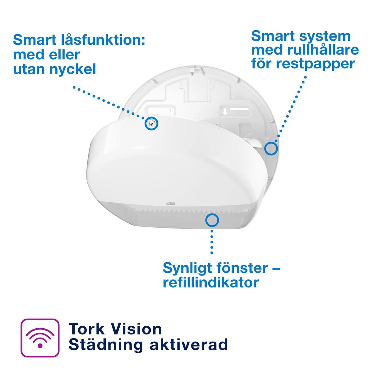 Smart hållare för rullen möjliggör fullständig förbrukning av rullen och minimerar mängden avfall Med optimal rullbroms slipper du fritt roterande rullar och minskar därmed förbrukningen Genomskinligt fönster gör det möjligt att se när det är dags för påfyllning