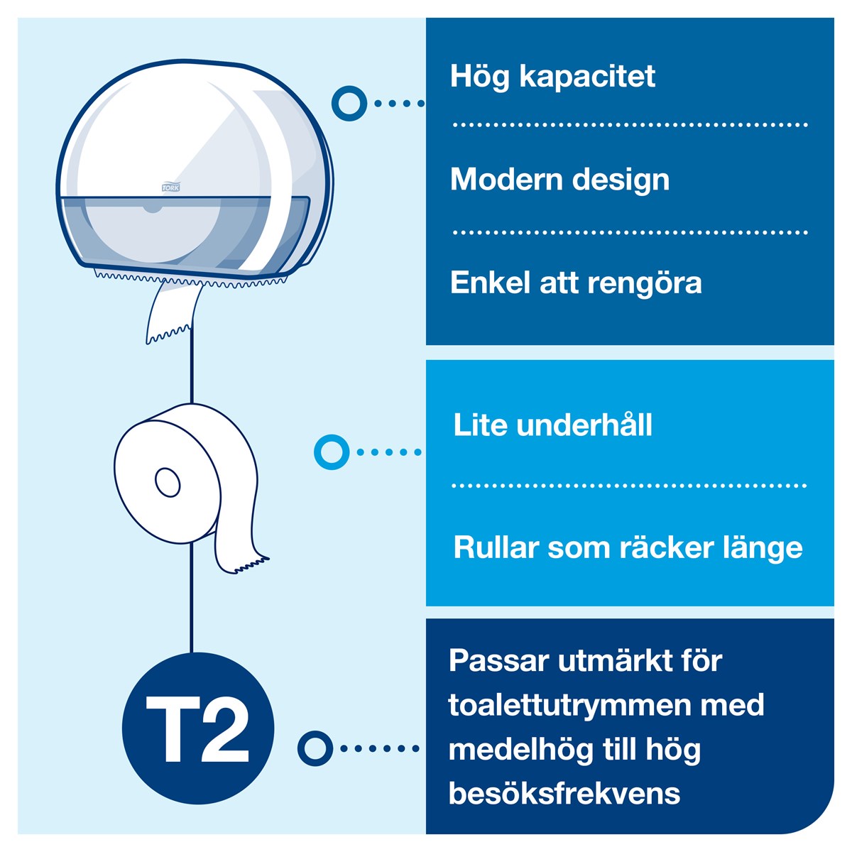 Tork Dispenser Mini Jumbo Toalettpapper i Elevation design passar perfekt för medel- till högtrafikerade toalettutrymmen, där det är viktigt att nyttja tiden effektivt och hålla kostnaderna låga. Den höga kapaciteten minskar tiden för underhåll och garanterar att det alltid finns papper. Tork Elevation dispensrar har en stilren, funktionell och modern design som skapar ett långvarigt intryck hos dina besökare.